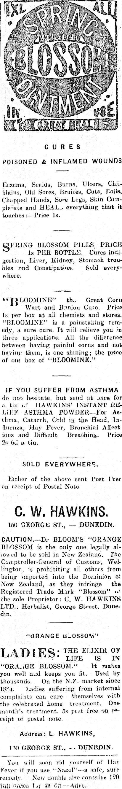 CURES POISONED & INFLAMED WOUNDS Eczema, Scalds, Burns, Ulcers, Chilj blains, Old Sores, Bruistes, Cuts, Foils, j Chapped Hands, Sore Legs, Skin Co.nJ pla : uts and HEAL., everything that it 1 touches :—Price Is. QPIUNG BLOSSOM PIi,LS, PRiCE ° Is PER BOTTLE. Cures indigestion, Liver, Kidney, Stomach troubles rnd Constipation. Sold everywhere. “ j£LOOi\IINE” th„ Great Corn Wart and B onion Cuie. Price Is per box at all chemists and stores. “BLOOMINE” is a painstaking remedy, a sure cure. It wiit relieve you in three applications. All the difference between having painful corns and not having them, is one shilling; the price of ntu box of “BLOOMINE.” IF YOU SUFFER FROM ASTHMA do not hesitate, but send at jnce for a tin of HAWKINS' INSTANT RELIEF ASTHMA POWDER—For Asthma, Catarrh, Cold in the Head, Influenza, Hay Fever, Bronchial Affect ions and Difficult Breathing. Price 2s 6u a tin. SOLD EVERYWHERE. Either of the above sent Post Frer on receipt of Postal Note C. W. HAWKINS. 150 GEORGE ST., DUNEDIN. CAUTION.— Dr BLOOM’S “ORANGE BLOSSOM is the only one legally allowed to be sold in New Zealand. The Comptroller-General of Customs, Wellington. is prohibiting all others from being imported into the Dominion of New Zealand, as they infringe the Registered Trade Mirk “Biussom” <•’ the sole Proprietor: C. W. HA WKINS LTD.. Herbalist, George Street, Dunedin. “ORANGE B_OSSOto” LADIES: “ORA.iGE BLOSSOM.” It makes you well and keeps you fit. Used by thousands. On the N.Z. market since IS°4. Ladies suffering from internal complaints can cure themselves with the celebrated home treatment. One month’s treatment. 5s pest free on r* 5 - ceipt- of postal note. Address: L. HAWKINS, IV) GEORGE ST..-- DUNEDIN. Von will soon rid yourself of Hay Fever if you use ‘•Naizol” —a safe, sure remedy New double size rontaiini 120 lii it do-res L-r i* cki A (lit