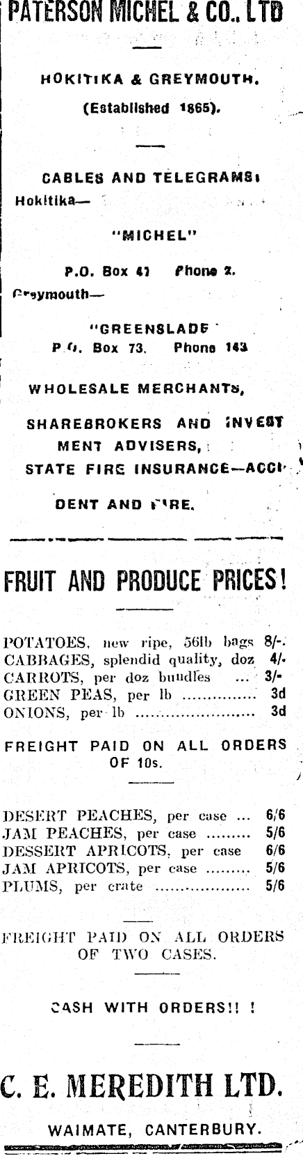 PATERSON MCHEL l CO.. LTD HOKITIKA & GREYMOUTH. (Established 1865). CABLES AND TELEGRAMS! Hokitika—•'MlCHEL" p.O. Box 41 Phone a. PIymouth—"GREENSLADE P U. Box 73. Phono 143 J WHOLESALE MERCHANTS, SHAREBROKERS AND INVEST MENT ADVISERS, STATE FIRE INSURANCE—ACCL DENT AND C'RE. FRUIT AND PRODUCE PRICES! POTATOES, now ripe, 561 b bogs 8/-. CABBAGES, splendid quality, doz 4/CARROTS, per doz bundles ... 3/* GREEN PEAS, per lb 3d ONIONS, per lb 3d FREIGHT PAID ON ALL ORDERS OF 10s. DESERT PEACHES, per case ... 6/6 JAM PEACHES, per case 5/6 DESSERT APRICOTS, per case 6/6 JAM APRICOTS, per case 5/6 PLUMS, per crate 5/6 FREIGHT PAID ON ALL ORDERS OF TWO CASES. CASH WITH ORDERS’! ! C. E. MEREDITH LTD. WAIMATE, CANTERBURY.