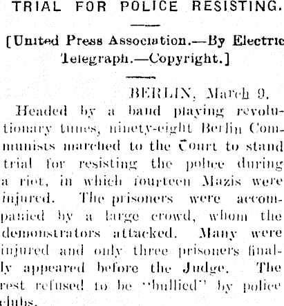 TRIAL FOR POLICE RESISTING. [United Press Association.—By Electric Telegraph.—Copyright.] BERLIN, March 9. Headed by a hand playing revolutionary times, ninety-eight Berlin Coiiimimisis marched to the Court to stand trial for resisting the police during a riot, in which fourteen Alazis were injured. The prisoners were accompanied by a large crowd, whom the demonstrators attacked. Many were injured ami only three prisoners finally appeared before tile Judge. The rest retimed to he “bullied'’ by police clubs.