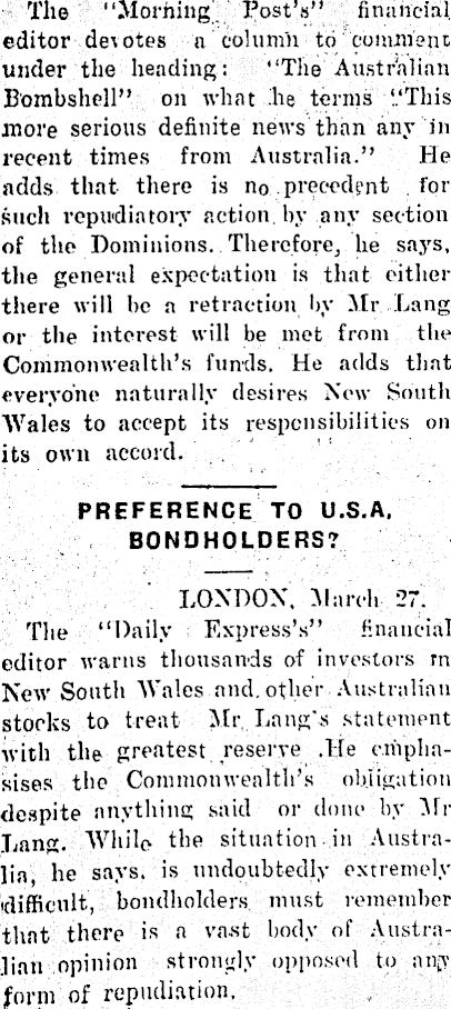 The “Morhing. Post’s” financial, editor devotes a column to comment under the heading: “The Australian Bombshell” on what he terms ‘.‘This more serious definite news than any in recent times from Australia.” He adds that there is no precedent for such repudiatory action by any section of the Dominions. Therefore, he says, the general expectation is that either there will be a retraction by Mr Lang or the interest will be met from the Commonwealth’s funds. He adds that everyone naturally desires New South Wales to accept its responsibilities on its own accord. PREFERENCE TO U.S.A, BONDHOLDERS? LONDON, March 27. The “Daily Express’s” financial editor warns thousands of investors rn New South Wales and. other Australian stocks to treat Mr Lang's statement with the greatest reserve .He emphasises the Commonwealth’s obligation despite anything said or done hv Mr Lang. While the situation in Australia, he says, is undoubtedly extremely difficult, bondholders must remember that there is a vast body of Australian opinion strongly opposed to any form of repudiation,