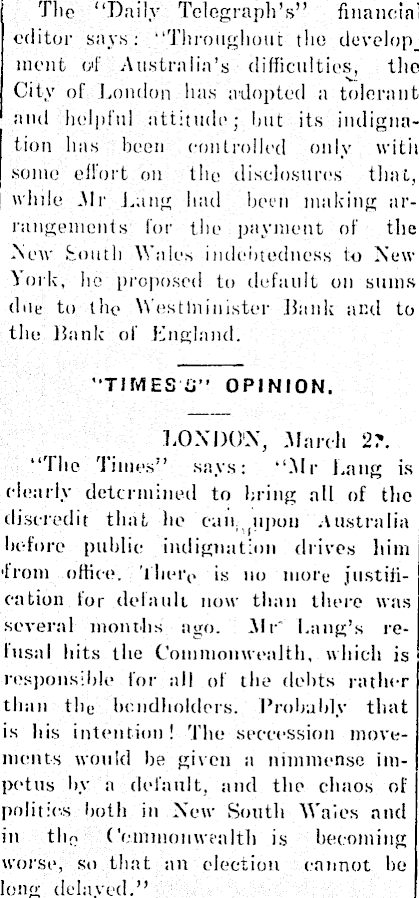 The “Financial Times” says there is no development in the Australian situation, that has done so much damace as Mr Lang’s decision. A record of the price movements tells the story. Credit is crocking at a point at which it would be foolish for this, and any other country, to lend money without, a real assurance that the debtor would follow sound courses. These events have occurred at a profoundly unfortunate time when the Commonwealth’s export trade was increasing and the commodity outlook seems better. There is no doubt that London would lend aid, hut it is bound to insist that the borrower give safeguards against bankruptcy. The “Daily Herald” regards Mr Lang’s remitting to New York and not meeting London obligations, as the final insult.