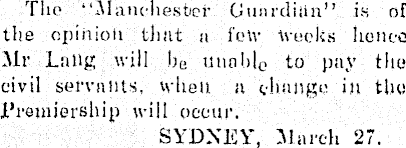 The “Maneliestiei- Gunrdilin” is of the opinion that a few Weeks hence Mr LaUg will ho unable to pay the civil servants, when a change in the Premiership will occur. SYDNEY, March 27.