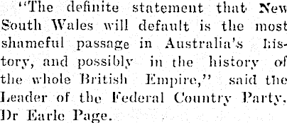“The definite statement that New South Wales will default is the most shameful passage in Australia’s history, and possibly' in the history’ of the whole British Empire,” said the Leader of the Federal Country Party. Dr Earle Page.