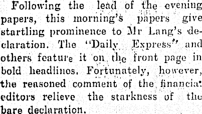 Following the lead of the evening papers, this morning’s papers give startling prominence to Mr Lang’s declaration. The “Daily Express''' and others feature it on., the front page in bold headlines. Fortunately, however, the reasoned comment of the, financial editors relieve the starkness of the bare declaration.