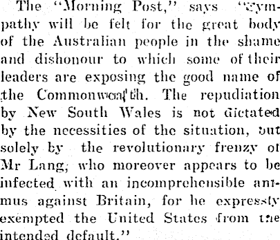 The “Morning Post,” says “sympathy will he felt for the great body of the Australian people in the sluimo and dishonour to which some of their leaders are exposing the good name of the Commonweinf'tih. The repudiation by New South Wales is not dictated by the necessities of the situation, nut solely by the revolutionary frenzy ot Mr Lang, who moreover appears to he infected with an incomprehensible animus against Britain, for be expressly exempted the United States from trie intended default.”