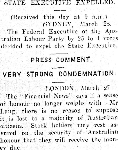 STATE EXECUTIVE EXPELLED. (Received tin's rlav at. 9 n.m.) SYDNEY, March 23. The Federal Executive of the Australian Labour Party by 25 to 4 votes decided to expel the State Executive. PftESS COMMENT. VERY STRONG CONDEMNATION, LONDON, March 27, The “Financial News” says if a sense of honour no longer weighs with Mr Lang, there is no reason to suppose it is lost to a majority of Australian citizens. Stock holders may rest assured on the security of Australian honour that they will receive the money due.