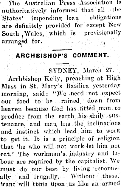 The Australian Press Association is authoritatively’ informed that all the States’ impending loan obligations aro definitely provided for except New South ( Wales, which is provisionally arranged for. ARCHBISHOP’S COMMENT. SYDNEY, March 27. Archbishop Kelly, preaching at High Mass in St. Mary’s Basilica yesterday morning, said: “We need not expect our food to be rained down from heaven because God lias fitted man to produce from the earth his daily sustenance, and mail has the inclinations and instinct which lead him to work to get it. It is a principle of religion that ‘he who will not work let him not oat.’ The workman’s industry and labour are required by the capitalist. We must do our best by living ecnomically’ and 'frugally. Without these, j Want will CO trie Upon us like ah armed