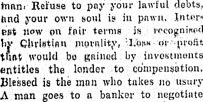 iuani Refuse to pay your lawful debts, hnd your own soul is in pawn. Inter* nut now on fair terms is recognised by Christian morality, Loss or profit that would be gained by investments entitles the londer to compensation. Blessed is the man who takes no usury A man goes to a banker to negotiate