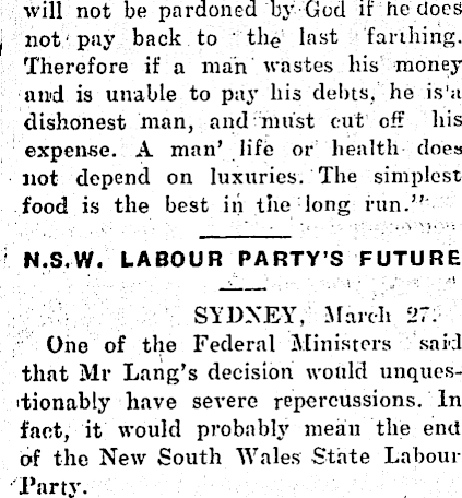 will not be pardoned by God if he docs I not pay back to th e last 'farthing. Therefore if a man wastes his money and is unable to pay his debts, he is'a dishonest man, and must cut of? his expense. A man’ life or health does not depend on luxuries. The simplest food is the best in the long run.” N.S.W. LABOUR PARTY’S FUTURE SYDNEY, March 27. One of the Federal Ministers said that Mr Lang’s decision would unquestionably have severe repercussions. In fact, it would probably mean the end of the New South Wales State Labour Party.