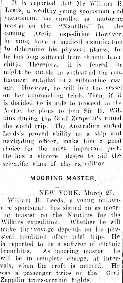 It is reported that Air William B. Leeds, a wealthy’ young sportsman and yacuismaii. has enrolled as motoring master on the ‘‘Nautilus” for the coming Arctic expedition. However, ho must have a medical examination to determine his physical fitness, for he has long suffered from chronic bronchitis. Therefore. it is I’eni-ed lie might lie unable to withstand the* confinement entailed in a submarine voyage. However, lie will join the vessel on her approaching trials. Then, if it is decided he is able to proceed to th* Arctic-, lie plans to join Sir 11. Wilkins during the Graf Zeppelin’s round tlie world trip. Tip* Australian stated Leeds’s proved ability as a ship and navigating officer, make him a good choice for the most important post. He has a sincere desire to aid the scientific aims of the expedition. MOORING MASTER. NEW YORK," March 27. William B. Leeds, a young millionaire sportsman, has signed on as mooring master on the Nautilus for the Wilkins expedition. Whether lie will make the'voyage depends mi his phv- j sicnl condition after trial trips, He is reported to lie a sufferer of chronic, bronchitis. As mooring master lie will he in complete charge, at intervals, when the craft is moored. He was a passenger twice on tlio Graf Zeppilin trans-oepanic flights.