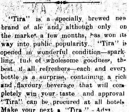 . “Tifa” is. a . Specially. brewed new brand of. ale and,} althuligb only od the mar kef, a Jew,months, has won it* 'it ay into, public .popularity. . “Tira” » opened iii wpnderful condition —sparkling, fui/i of .wholesome goodness, tbbest. ,)J., all/refresbers—each and every bottle rs a surprise, containing, a rich and Jflavdury beverage that will com pletely ,win ; your, taste and approval VTira” can be ,procured at all hotel* Make your next a “Tira ” -