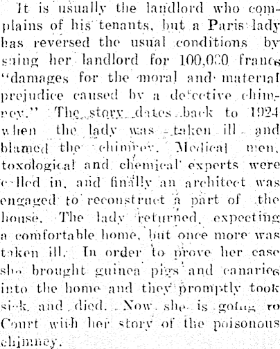 it is usually the landlord who complains of his tenants, hut a Paris lady has reversed the usual conditions by suing her landlord for IOO.CCO francs “damages for the -moral and- material' prejudice caused hv a defective c-him.-rey.” ' Tlic v .story. .dates ..back to 15)24 v. lien the lady was -.taken ill. and blamed the ■ chimi'ov. ' "Medical men, toxologica! and chemical' experts were oiled in. and finally an architect was engaged to reconstruct a part of the house. Idle lady returned, expecting a comfortable home, but once more was taken ill. In order to prove her case slto brought guinea pigs and canaries into the home and they"-promptly tool; si-k. and . died. . Xmv. she- is goiu- r<> Court with her story of the poisonous chimney.