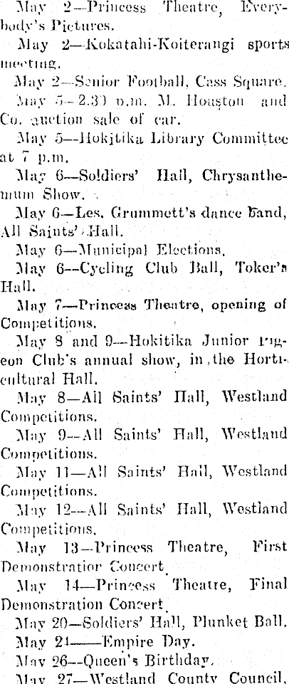 May 2 Princess Theatre Everybody's Pictures. May 2—Kokatahi-Koitcrangi sports me.'ting. May 2—Senior Football. Cass Square. May b—2.3) n.m. M. Houston and Co. auction sale of ear. .May b—Hokitika Library Committee at 7 p.m. May G—Soldiers’ Hail, Chrysantheimun Show. May 6—Les. Grummett’s dance hand, All Saints’■■.Mail. May G—Municipal Elections, May 6—Cycling Club Ball, Tokcr’n Hall/ May 7—Princess Theatre, opening of Competitions. May 8 and 9—Hokitika Junior Lugeon Club's annual show, in the Horticultural Hall. May B—All Saints’ Hall, Westland Competitions. May 9—All Saints’ Hall, Westland Competitions. May 11—All Saints’ Hall, Westland Competitions. May 12—All Saints’ Hall, Westland Competitions. May 13—Princess Theatre, First Demonstration Co nce rt _ May 14—Princess Theatre, Final Demonstration Concert. May 20—Soldiers’ Had, Phinket Ball. Mny 21 Empire Day. Mav 26—Queen’s Birthday, May 27—Westland County Council