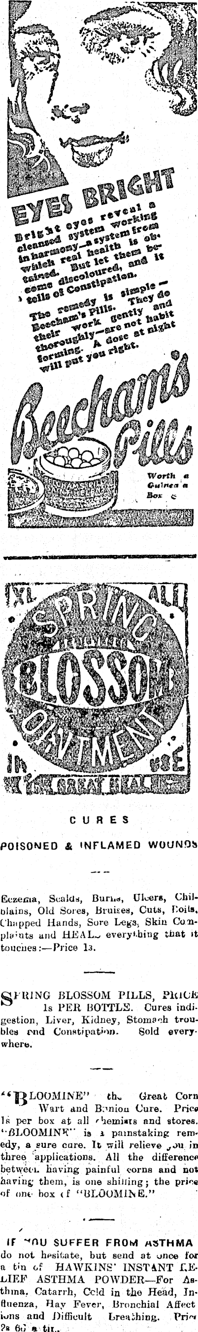 1 4T'i <r£rs*« SSffSSS^r »»w*‘** 4S »‘tSi(«* ** z&k^iS' TsSss&z?* 1 * ■* L$ Worth a Guinea n Bo* s 0 % «s£ m SMSHIKD CURES POISONED & INFLAMED WOUNDS Eczema, Scalds, Burns, Dicers, Chilblains, Old Sores, bruises, Cuts, boils, Chapped Hands, Sore Legs, Skin Comply ; uts and everything that it touches:—Price 13. OFUJNG BLOSSOM PILLS, PRIOR ° Is PER BOTTLE. Cures indigestion, Liver, Kidney, Stomach troubles ond Constipation. Sold everywhere. t * LOOMINE’’ Great Corn Wart and Bunion Cure. Price Is per box at all rhemiais and stores. ‘ BLOOM1NK" is a painstaking remedy, a sure cure. It will relieve in three applications. All the difference between having painful corns and not having them, is one shining; the price of one box <f “BLOOMIN E. m IF SUFFER FROM ASTHMA do not hesitate, but send at once for a tin of HAWKINS’ INSTANT RELIEF ASTHMA POWDER—For Asthma, Catarrh, Ccld in tile Head, Influenza, Hay Fever, Bronchial Affect ions and Difficult Lreaihing. ?s 6d a tit..