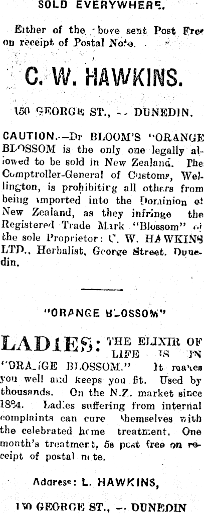 SOLD EVERYWHERE. Either of the hove sent Post Free on receipt, of Postal Note. C. W. HAWKINS. 150 9FORGE ST., - - DUNEDIN. CAUTION.— Dr BLOOM’S “ORANGE BLOSSOM is the only one legally allowed to be sold in New Zealand. The Comptroller-General of Customs, Wellington, is prohibiting all others from being imported into the Dominion oi New Zealand, as they infringe the Registered Trade Mark “Blossom” the sole Proprietor: C. W. HA WKINS LTD.. Herbalist, George Street. Dunedin. "ORANGE BLOSSOM" LADIE • THE El jXlit OF LIFE Tfl J-N “ORANGE BLOSSOM.” It raa\e® you well and keeps you fit. Used by thousands. On the N.Z. market since ISS4. Ladles suffering from internal complaints can cure themselves with the celebrated heme treatment. One month’s treatment, 5s pest free on receipt of postal n< te. Adares c : L. HAWKINS, IYI GEOROE ST., -• DUNEDIN
