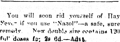 You will soon rid yourself of Hay Fevu” if ' r ou use ‘'Na.zol”—n safe, sure reinedv New double size coe'n ius 120 fu! 1 do*«s to: 2b fld.—Adit.