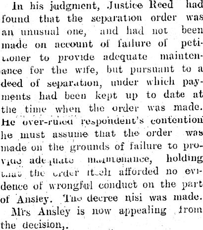 in his judgment, Justice. Reed had found that the separation order was an unusual one, and had not been made on account oi failure of petiuoner to provide adequate maintenance for the wife, but pursuant to a deed of separation, under which payments had been kept up to date at the time when the order was made. He over-ruiou respondent's contention lie must assume that the order was made on the grounds of failure to provpio adt piato niainteiiaiice, holding t.iat tin order lt.eli afforded no evidence of wrongful conduct on the part of Ansley. Tao decree nisi was made. Airs Ansley is now appealing from the decision,.