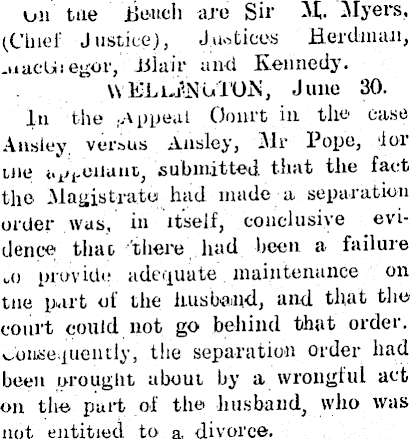 on tne Bench are Sir M,. Myers, (.Chief Justice), Justices Herdman, -tiacijii egor, Blair and Kennedy. \\ ELiJNuiON, June 30. In the .Appeal Court in the case Ansiey versus Ansley, All' Pope, ioi uie api-ciiaut, submitted that the fact the Magistrate had made a separation order was. in itself, conclusive evidence that there had been a failure „() provide adequate maintenance on tne part of the husband, and that the court could not go behind that order, consequently, the separation order had been drought about by a wrongful act on the part of the husband, who was not entitled to a, divorce.