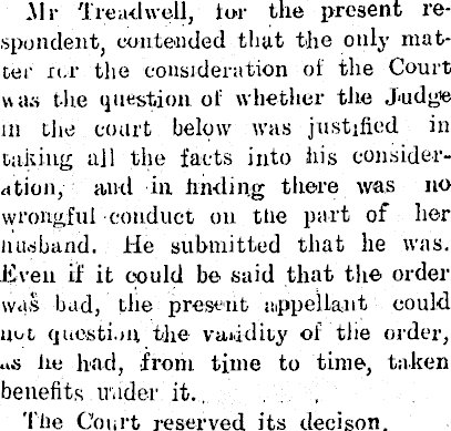 Air Treadwell, tor the present respondent, contended that the only matter it.r the consideration of the Court was the question of whether the Jaidg l e m the court below was justified in taking all the facts into his consideration, and in finding there was no wrongful conduct on the part of her luisband. He submitted that lie was. Even if it could be said that the order was bad, the present appellant could lmt question the validity of the order, «s lie had, from time to time, taken benefits trader it.. . The Court reserved its decison.