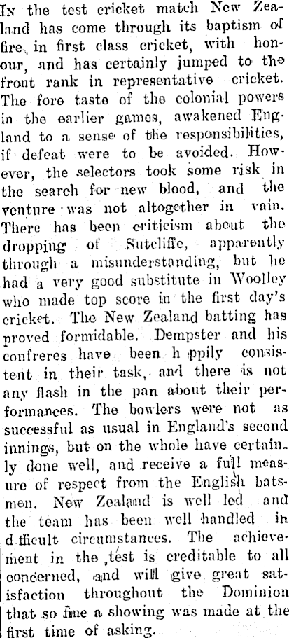 lx the test cricket match New Zealand has come through its baptism of fire, in first class cricket, with honour, and has certainly jumped to the front rank in representative cricket. The fore taste of the colonial powers in the earlier games, awakened England to a. sense' of tihe responsibilities, if defeat were to be avoided- However, the selectors took some risk in the search for new blood, and the venture was not altogether in vain. There has been criticism about the dropping of Sutcliffe, apparently through a misunderstanding, but ho had a very good substitute in Woolley who made top score in the first day’s cricket. The New Zealand batting has proved formidable. Dempster and his confreres have been h ppily consistent in their task, and there is not any flash in the pan about their performances. The bowlers wore not as successful as usual in England's second innings, but on the whole have certainly done well, and receive a full measure of respect from the English batsmen. New Zealand is well led and the team has been well handled in d tficult circumstances. The achievement in the „test is creditable to all concerned, and willl give great satisfaction throughout the Dominion 1 that so fine a showing was made at the I first time of asking.