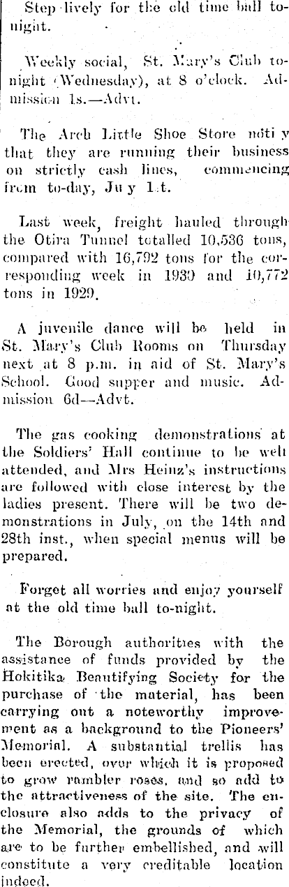 Stop-lively tor the old time hid] tonight. V.'eekly social, St. .Mary’s Cluh tonight ‘ Wednesday), at 8 o’clock. Admission Is.—Advt. The Arcli Little Shoe Store ndti v that they are running their business on strictly cash lines, commencing from to-day, Ju y I t. Tnist week freight hauled through the Otira Tunnel totalled 10,530 tons, compared with 16,792 tons for the corresponding week in 1930 and i(),772 tons in 1929. A juvenile dance will be held in St. Mary's Cluh Rooms on Thursday next at 8 p.m. in aid of St. Mary’s School. Good supper and music. Admission 6d—-Advt. The gas cooking demonstrations at the Soldiers’ Hall continue to lie well attended, and Mrs Heinz’s instructions are followed with close interest by the ladies present. There will be two demonstrations in July, on the 14th and 28th inst., when special menus will be prepared. Forgot all worries arid enjoy yourself at the old time ball to-night. The Borough authorities with the assistance of funds provided by the Hokitika Beautifying Society for the purchase of the material, has been carrying out a noteworthy improvement as a background to the Pioneers’ Memorial. A substantial trellis has been erected, over which it is proposed to grow rambler roses, and so add t<> the attractiveness of the site. The enclosure also adds to the privacy of the Memorial, the grounds of which arc- to he further embellished, and .will constitute a very creditable location indeed.