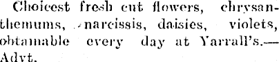 Choicest fresh cut flowers, chrysanthemums, narcissis, daisies, violets, obtainable every day at Yarrall’s.— Advt.
