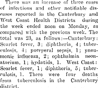 There was an increase of three cases of infectious and other notifiable discuses reported in the Canterbury and West Coast Health Districts during the week ended noon on Monday, as compared with the previous week. The total was 23, as follows:—Canterbury: Scarlet fever, 3; diphtheria, 4; tuberculosis, 4; puerperal sepsis, 1; pneumonic influenza, 2; ophthalmia neonatorium, 1; hydatids, 1. West Coast: Scarlet fever, 1; diphtheria, 5; tuberculosis, 1. There were four deaths from tuberculosis in the Canterbury’ district.