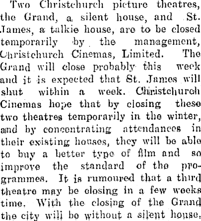 Two Christchurch picture theatres, the Grand, a, silent house, and St. James, a talkie house, are to be closed temporarily by the management, Christchurch Cinemas, Limited. The Grand will close probably this week and it is expected that St. James will shut within a week. Christchurch Cinemas hope that by closing these two theatres temporarily in the winter, and by concentrating attendances in their existing houses, they will be able to buy a better type of film and so improve the standard of the programmes. It is rumoured that a third theatre may be closing in a few weeks time. With the closing of the Grand the city will bo without a silent house,