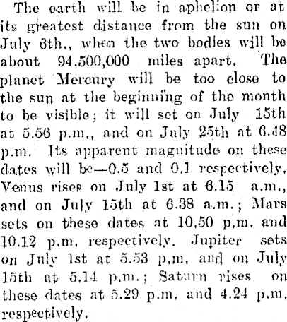 The earth will be in aphelion qr at its greatest distance from the sun on July 6th,, when the two bodies will he about 94,500,000 miles apart. The planet Mercury will be too close to the sun at the beginning of the month to be visible; it will sot on July 15th at 5.56 p.m,, and on July 25th at 6.<18 p.m. Its apparent magnitude on these dates will be—o.s and 0,1 respectively. Venus rises on July Ist at 6.15 a.m,, and on July 15th at 6.38 a.m.; Mars sets on these dates at 10,50 p.m. and 10.12 p.m, respectively. Jupiter sets on July Ist at 5.53 p,m, and on July 15th at 5,14 p.m.; Saturn rises on these dates at 5.29 p.m, and 4.24 p.m, respectively.