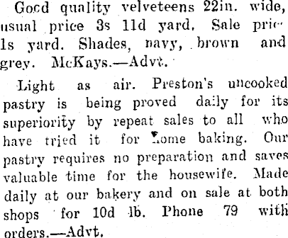 Good quality velveteens 22in. wide, usual price 3s lid yard. Sale pric Is yard. Shades, navy, . brown and grey. McKays.—Advt. Light as air. Preston’s uncooked pastry is being proved daily for its superiority by repeat sales to all who have tried it for T.orne baking. Our pastry requires no preparation and saves valuable time for the housewife. Made daily at our bakery and on sale at both shops for lOd lb. Phone 79 with orders. —Advt.