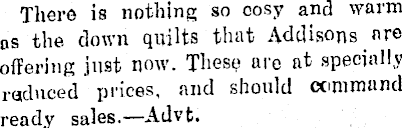 There is nothing so cosy and warm ns the down quilts that Addisons are offering just now. These are at specially reduced prices, and should ccm round ready sales. —Advt.