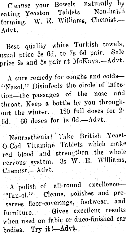Cleanse your Bowels naturally by eating Yenst-on Tablets. Non-habit forming. AAL 11. "Williams, Chemist. A d v t. Best quality white Turkish towels, usual price 3s 6d, to 7s 6d pair. Sale price 2s and 5s pair at McKays.—Advt. A sure remedy for coughs and colds—“Nazol.” Disinfects the circle of infection— the passages of the nose aiid throat. Keep a bottle by you throughout the winter. ■ 120 full doses for 2> (Id. 60 doses for Is fid.—Advt. Neurasthenia! Take British Yeast-O-Cod Vitamine Tablets which make red blood and strengthen the whole nervous system. 3s AY. E. Williams, Chemist. —Advt. A polish of all-round excellence—-“Tan-ol.” Cleans, polishes and preserves floor-coverings, footwear, and furniture. Gives excellent results when used on fabic or duco-fmished car bodies. Try it I—Advt.