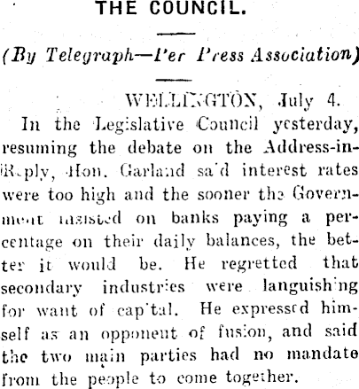 THE COUNCIL. (By Telegraph —Per Press Association) WKI.IffNGTOX, July 4. In the Legislative Council yesterday, resuming the debate on the Address-in-ii-Lply, lion. Garland sa d interest rates were too high and the sooner the Government insisted on banks paying a percentage on their daily balances, the better it would be. He regretted that secondary industries were languish ng for want of cap'tal. He expressed himself as an opponent of fusion, and said the two main parties had no mandate from the people to come together.
