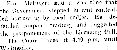 'Hon. Mclntyre said it was time that the Government stepped in and controlled borrowing by local bodies. He defended coupon trading, and suggested the postponement of the Licensing Poll. The Council rose at 4.40 p.m. until Wednesday.