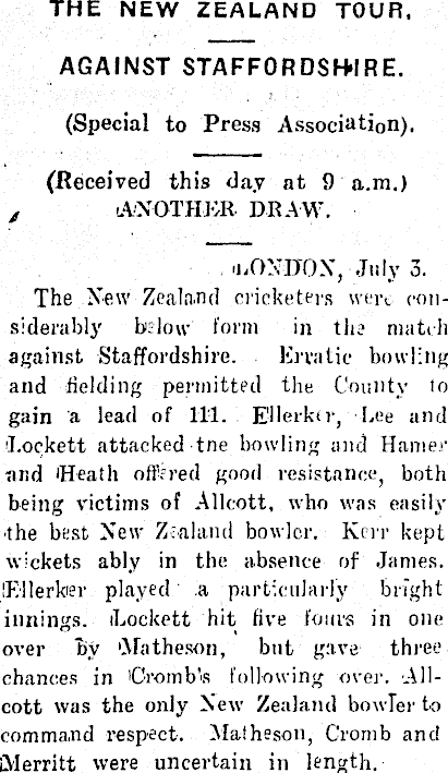 THE NEW ZEALAND TOUR. AGAINST STAFFORDSHIRE. (Special to Press Association). (Received this day at 9 a.m.) , ANOTHER DRAW. mONIJOX, July o. The New Zealand cricketers were considerably below form in the match against Staffordshire. Erratic bowling and fielding permitted the County to gain a lead of 111. E'llerkt r, Lee and Lockett attacked tne bowling and Hamer and 'Heath offered good resistance, both being victims of Allcott, who was easily -the best New Zealand bowler. Kerr kept wickets ably in the absence of James. lEllerkier played a particularly bright innings. (Lockett hit live fours in one over by 'Matheson, but gave three chances in 'Cromb’s following over. Allcott was the only New Zealand bowler to command respect. Matheson, Cromb and Merritt were uncertain in length.