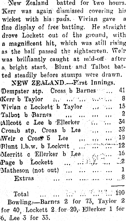 •New Zealand batted for 'two hours. Kerr was again dismissed covering his Wicket with his pads. Vivian gave a fine display of free, batting. He straight drove Lockett out of the ground, with a magnificent hit, which was still rising as the ball passed the sightscreen. Weir was brilfiantlv caught at mid-off after a. bright start, blunt and Talbot batted steadily before stumps were drawn. NEW ZEALAND.—First Innings, ©empster stp. Cross b Barnes ... 41 iKerr b Taylor ... "... 8 Vivian e Lockett b Taylor 15 Talbot b Barnes 2 Allcott c Lee b 'Ellerker ... ... 34 Cromb stp. Cross b Lee 32 (Weir o Cros!? B Lee ~, ~, ~, 19 Blunt l.b.w. b I.ock’ett . ..." ... '■..'.'■"l2 Merritt c Ellerker b Lee 16 (Page b Lockett ... :2 Matheson (not out) ... 1 Extras 8 Total ... ... 190 Bowling/—Barnes 2 for 73, Taylor 2 for 40, Lockett 2 for 20,- Ellerker 1 for •6, Lee 3 for 33.