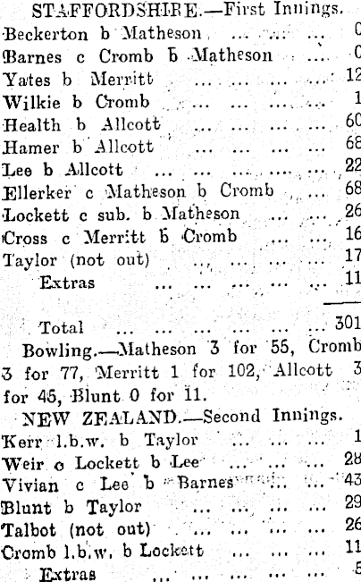 STAFFORDSHIE E.—First Innings. Beckerton b Matheson ... 0 Barnes c Cromb b -Matheson ... 0 Yates b Merritt ... 12 Wilkie b Cromb 1 Health b Allcott 60 Hamer b Allcott 68 Lee b Allcott .... ... 22 Ellerker c Matheson b Cromb . ... 68 Lockett c sub. b Matheson ... ... .26 (Cross c Merritt b -Cromb 16 Taylor (not out) .... 17 Extras D Total ... ... 301 Bowling.—-Matheson 3 for 55, Cromb 3 for 77, Merritt 1 for 102, Allcott 3 for 45, Blunt 0 for 11. NEW ZEALAND.—Second Innings. Kerr l.b.w. b Taylor 1 "Weir o Lockett b -Lee ... ... ... 28 Vivian c Lee To •■ Barnes' r “- .'.. ... 43 Blunt b Taylor ... ... 29 Talbot (not out) . 26 Cromb l.bAv, b Lockett H Extras ~.
