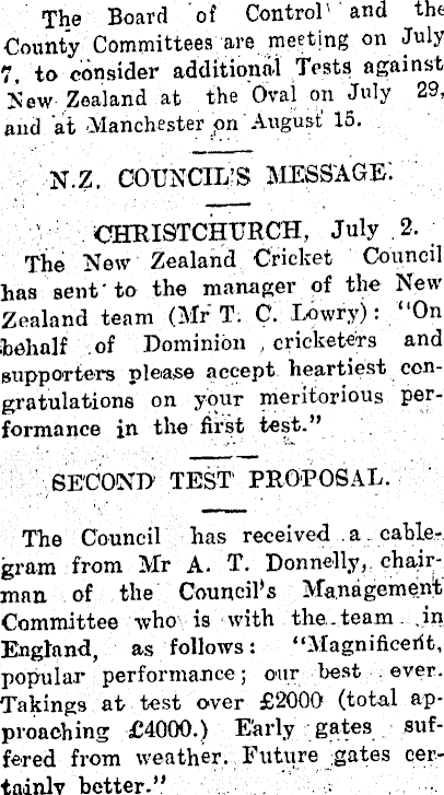 The Board of Control and the County Committees are meeting on July 7, to consider additional Tests against -Sew-Zealand at the Oval on July 29, and at Manchester pn August 15. N.Z. COUNCIL’S message: CHRISTCHURCH, July 2. _ The New Zealand Cricket Council has sent 'to the manager of the New Zealand team (Mr T. C. Lowry): “On behalf of Dominion cricketers and supporters please accept heartiest congratulations on your meritorious performance in the first test.” SECOND TEST' PROPOSAL. The Council has received a cablegram from Mr A. T. Donnelly, chairman of the Councils Management Committee who is with the - team in England, as follows: “Magnificent, popular performance; our best ever.Takings at test over £2OOO (total approaching £4000.) Early gates suffered from weather. Future gates certainly better.”