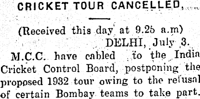 CRICKET TOUR CANCELLED, ... (Received this day at 9.2 b a.m) DELHI, July ,3. M.C.C. have cabled to the India Cricket Control Board, postponing the proposed 1932 tour owing to the refusal of certain Bombay teams to take part.