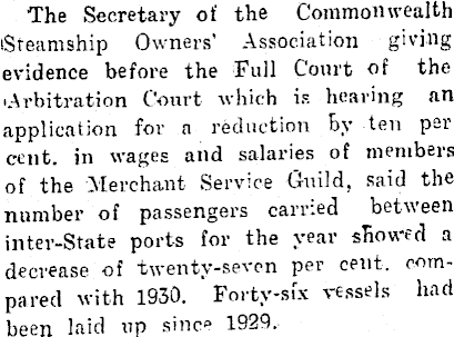 The Secretary of the Commonwealth Steamship Owners’ Association giving evidence before the Full Court of the .Arbitration Court which is hearing an application for a reduction by ten per cent, in wages and salaries of members of the Merchant Service Guild, said the number of passengers carried between inter-State ports for the year showed a decrease of twenty-seven per cent, compared with 1930. Forty-six vessels had been laid up sine* 1929.