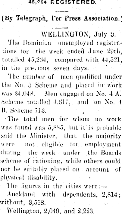 45,264 REGISTERED. [By Telegraph, Fer Press Association.) WELLINGTON, July is. Tile Dominica unemployed registrations tor the week endecl June 29th, totalled 45,234, compared with 44,521, in tne previous seven days. '1 he number of men qualified under the No. o Scheme and placed in work was 34,04.4. Alen engagt cl on No. -1 A. .■scheme totalled 4,017, and on No. 4 B. Scheme 713. , Tiie total men for whom no work was found was 5,885, but it is probable said the Minister, that the majority were not eligible for employment during the week under the Boards scheme of rationing, while others could not be suitably placed on account of physical disability. '1 lie figures in the cities were:— Auckland with dependents, 2,814; without, 3,568. Wellington, 2,010, and 2,223,