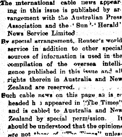 3The international cable news appear mg in this issue is published by arrangement with the Australian Press Association and the ‘ Sun 1 Herald ’ .News Service Limited By special arrangement, Reuter's world service in addition to other special sources of information is used in the compilation of the oversea intelligence published in this issue arid all rights therein in Australia and New Zealand are reserved. . Buch cable news on this page as is ec headed h 3 appeared in ‘‘'jTfce Times" and is cabled to Australia and Now Zealand by special permission. It should be understood that the opinion? j«re not „ n | eg ,