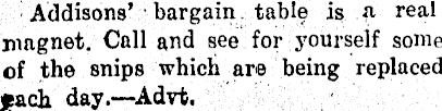 Addisons’ bargain table is n real magnet. Call and see for yourself some of the snips which are being replaced jsach day.—Advt.