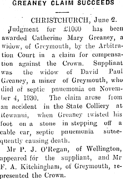 GREANEY CLAIM SUCCEEDS CHRISTCHURCH, June 2. Judgment for £IIOOO Ims been awarded Catherine Mary Greaney, a widow, of Greymouth, by the Arbitration Court in a claim for compensation against the Crown. Suppliant was the widow of David Paul Greaney, a miner of Greymouth, who died of septic pnuemonia on November 4, 1930. The claim arose from an accident in the State Colliery at iiewanui, when Greaney twisted his foot on a stone in stepping off a cable car, septic pnuemonia subsequently causing death. Mr P. J. O’Kegan, of Wellington, appeared for the suppliant, and Mr F. A. Kitchingham, of Greymouth, lepresented the Crown.