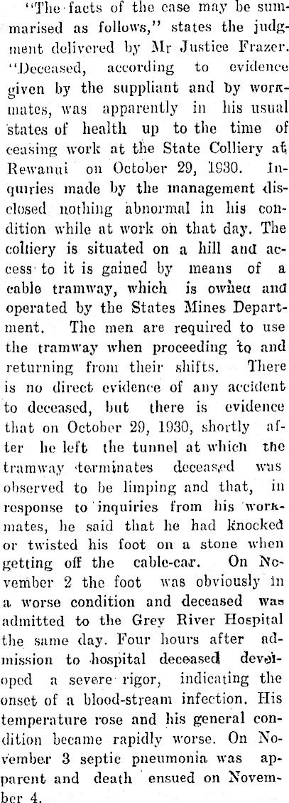 “The facts of the case may be summarised as follows,” states the judgment delivered by Mr Justice Frazer. “Deceased, according to evidence given by the suppliant and by wornmates, was apparently in his usual states of health up to the time of ceasing work at the State Colliery at Re-wanui on October 29, 1930. Inquiries made by the management disclosed nothing abnormal in his condition while at work oh that day. The colliery is situated on a hill and access’ to it is gained by means of a cable tramway, which is owueti and operated by the States Mines Department. The men are required to use the tramway when proceeding to and returning from their shifts. There is no direct evidence of any accident to deceased, but there is evidence that on October 29, 1930, shortly after he left the tunnel at which the tramway ‘terminates deceased was observed to lie limping and that, in response to inquiries from his workmates, he said that he had knocked or twisted liis foot on a stone when getting off the cable-car. On November 2 the foot was obviously in a worse condition and deceased was admitted to the Grey River Hospital the same day. Four hours after admission to hospital deceased developed a severe rigor, indicating the onset of a blood-stream infection. His temperature rose and his general condition became rapidly worse. On November 3 septic pneumonia was apparent and death ensued on November 4.