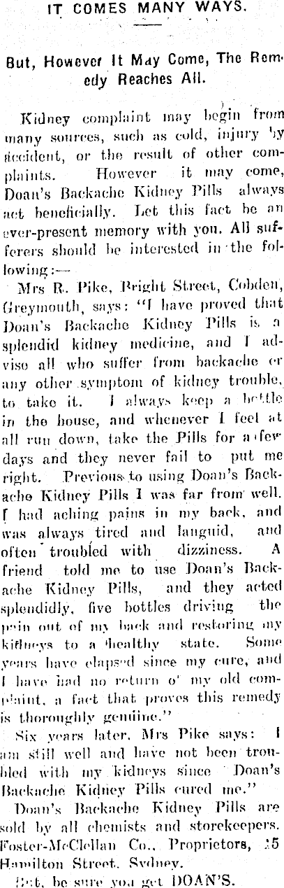 I IT COMES MANY WAYS. j But, However It May Come, The Remedy Reaches All. Kidney complaint may begin from many sources, such as cold, injmy iy (feculent, or the result of other complaints. However it may come, Doan’s Backache Kidney Pills always act beneficially. Let this fact he an ever-present memory with you. All sufferers should lie interested in the following; : Mrs R. Pike, Bright Street, Cobdeu, Greymouth, says: “I have proved that Doan’s Backache Kidney Pills if. a splendid kidney medicine, and I advise all who suffer from backache or any other symptom of kidney trouble, to take it. I always keep a bottle in the house, and whenever 1 feel at all run down, take the Pills for a Hew days and they never fail to put me right. Previous-to using Doan’s Backache Kidney Pills I was far from well. T had aching pains in my back, and was always tired and languid, and often' troubled with dizziness. A friend told me to use Doan’s Backache Kidney [’ills, and they acted splendidly, five bottles driving the I>•>im out of my hack and restoring mv kidneys to a ‘healthy state. Some years have elaps'd since my cure, and I have had no return o' my old eom-i-biint. a fact that proves this remedy is thoroughly' genuine.” Six years later. Mrs Pike says: I am still well and have not been troubled with my kidneys since Doan’s Backache Kidney Pills cured me.” Doan’s Backache Kidney Pills are sold by all chemists and storekeepers. Foster-McClellan Co.. Proprietors, .15 Hamilton Street. Svdnev. Ret, he sure you get DOAN’S.