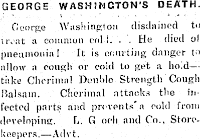 GEORGE WASHINGTON’S DEATH. George Washington disdained to ;i vat a common eo Li. . . He died ol pneumonia! It is courting danger t ; > allow a cough or cold to get a ho.d—take Cherimnl Double Strength Cough Balsam. Cherimnl attacks the infected parts and prevents'a cold from developing. L. G oeh and Co., Storekeepers.—Advt.