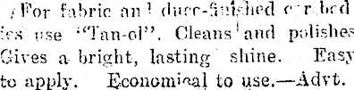 • For fabric an 1 chirr-fini-hed f, ' r bed irs pse ; ‘Tan-ol”. Cleans ! and polishes Gives a bright, lasting shine. Easy to apply. Economical to use.—Advt.