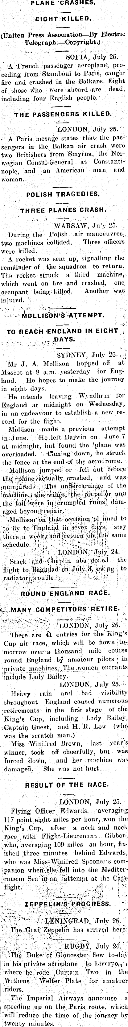 PLANE CRASHES. -EIGHT'KILLED. (Unitea Press Association—By Electric Telegraph.—-Copyright.) SOFIA, July 25. A French passenger aeroplane, proceding from Stamboul to Paris, caught fire and crashed in the Balkans. Eight of those ridio were aboard ;are dead, including four English people, THE PASSENGERS KILLED. LONDON, July 25. A Paris mesage states that- the passengers in the Balkan air crash were two Britishers from Smyrna, the Norwegian Consul-General at Constantinople, and an American man and woman. POLISH TRAGEDIES. THREE PLANES CRASH. WARSAW, Ju’y 25. During the Polish air manoeuvres, two machines collided. Three officers were killed. A rocket was sent up, signalling the remainder of the squadron to return. The rocket struck a third machine, which went on fire and crashed, one occupant being killed; Another was. injured. , .y[.i - MOLLISON’S ATTEMPT. TO REACH ENGLAND IN EIGHT DAYS. SYDNEY, July 26. J Mr J. A. Mollison hopped off at : Mascot at 8 a.m. yesterday 'for England. He hopes to make the journey in eight days. He intends leaving Wyndhnm for England at midnight on Wednesday, in an endeavour to establish a new record for the flight. Mollison made a previous attempt in June. He left Darwin on June 7 at midnight, but found the ’plane was overloaded. Coming down, he struck the fence at the end-of the aerodrome. Mollison jumped or fell out before the- ;’|)ldhe factually, crashed, and. was juninjuredi .. j. /The unftercjrrriage of the , ? machine,| the' wings* Itiiej ana the tail iwere in j crumpled ruins; damaged beyond- repair, ’.. /Mollison' on that-occasion.pj lined to to fly to England.; ia ;sbyfe)i . stay there a week,vrind;return’.oh .jttib! same schedule. »•; M'i , LONDON' July; 24. Stack i arid Chaplin alia; doi.ed the flight to Baghdad on July J, o\V pg to radiatorrjrouble.:;; " • ROUND ENGLAND RACE, i. MANY COMPETITORS RETIRE. v "LONDON, July 25. There are 41 entries for the King’s Gup air race, which will be flown tomorrow over a thousand mile corirse round England by amateur pilots in private machines..; i ~The..ryqnieji entrants'* include Lady Bailey. LONDON, July 25. Heavy rain and bad visibility throughout England caused numerous retirements in the first stage of the King’s Cup, including Lady Bailey, > Captain Guest, and H. R. Low (who was the scratch man.) ; Miss Winifred Brown, last year’s, winner, took off cheerfully, but was forced clown, and her machine was damaged. She was not hurt. RESULT OF THE RACE. LONDON, July ?5, Flying Officer Edwards, averaging 117 point eight miles per hour, .won the King’s . Cup, after a neck and neck race with Flight-Lieutenant Gibbon, who, averaging 101) miles an hour, finished three minutes behind Edwards, who was Miss Winifred Spoonei’s companion when. she. fell into the Mediterranean Sea in an -attempt at the Cape flight. ZEPPELIN’S'PROGRESS. ;* ■ LENINGRAD, July 25. The‘Graf Zeppelin has arrived here. RUGBY, July 24. The Duke of Gloucester flew to-dav in his private aeroplane to Livnpo<y » where he rode Curtain Two in the IV ltliens Welter 1 Plate for amatuer (riders. The Imperial Airways announce a speeding up on the Paris route, which .will reduce the time of the journey by twenty minutes.