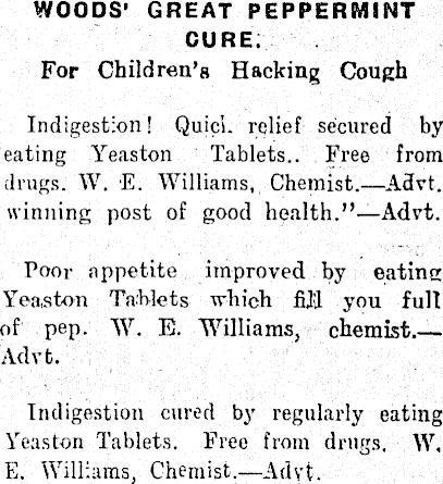 WOODS’ GREAT PEPPERMINT CURE. For Children's Hacking Cough Indigestion! Quid, relief secured by eating Yeaston Tablets.. Free from drugs. W. E. Williams, Chemist.—Advt. winning post of good health.”—Advt. Poor appetite improved by eating Yeaston Tablets which fill you full of pep. W. E. Williams, chemist.— Advt. Indigestion cured by regularly eating Yeaston Tablets. Free from drugs. W, E. Williams, Chemist.—Advt.